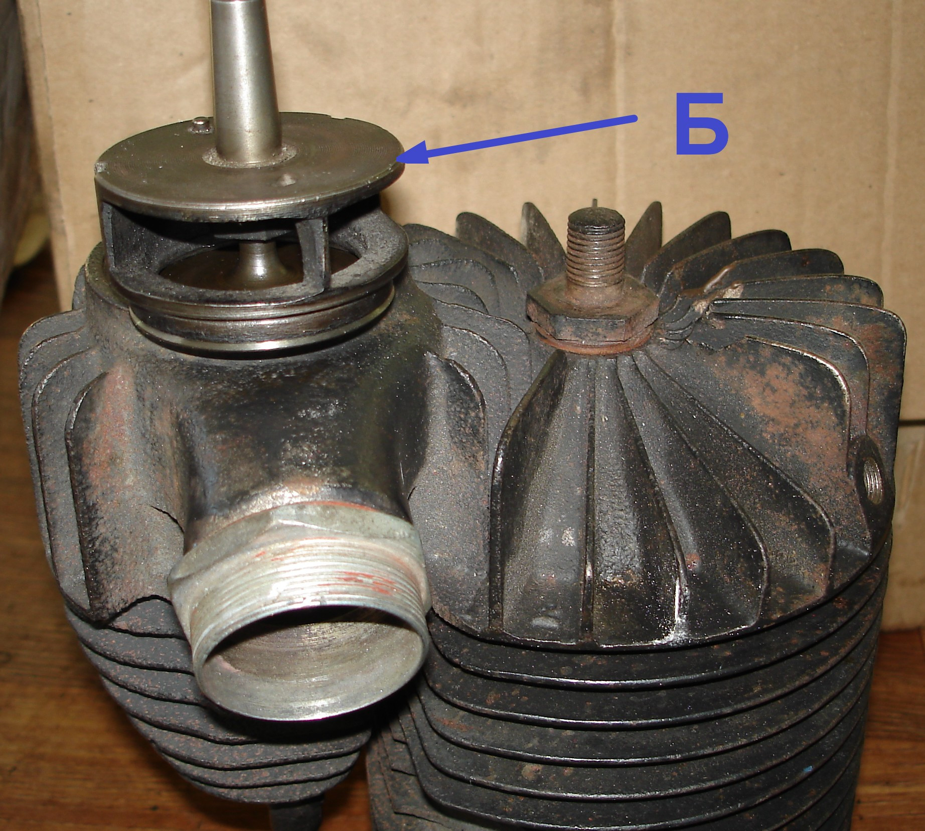 Конструкция цилиндров мотоцикла Harley-Davidson ранних выпусков такова, что клапанный механизм находится сбоку глухого цилиндра, смотри фото 1(А). В клапанном механизме впускной клапан расположен в отдельном корпусе в головке цилиндров, см. фото 2 (Б), а выпускной клапан посажен глубоко в теле головки цилиндров смотри фото 3 (В) и при таком расположении при работе клапаны «Впуск» и «Выпуск» перемещаются навстречу друг другу.