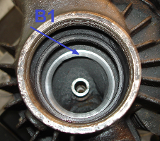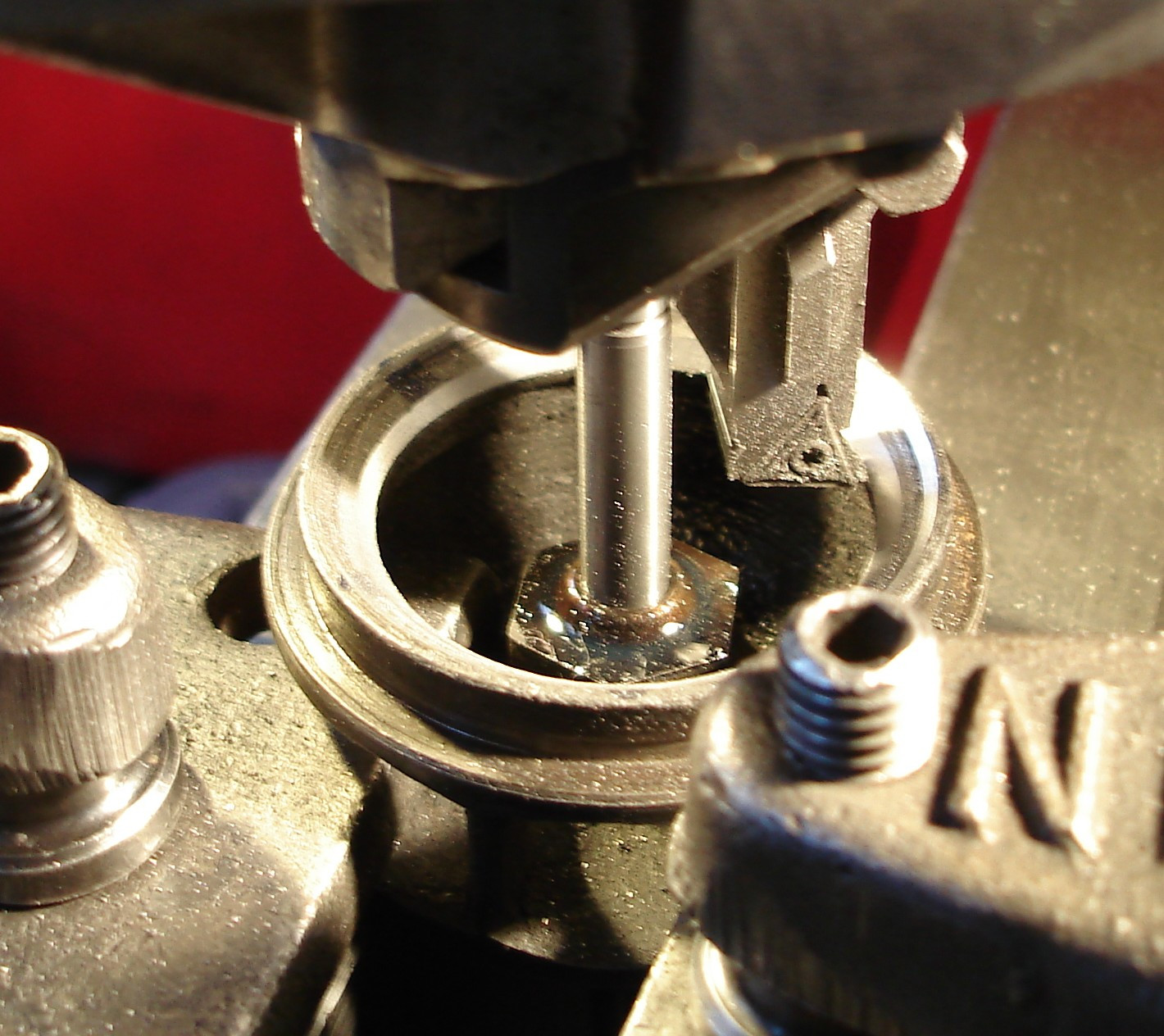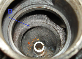 На фото 3 буквой (В) обозначена рабочая поверхность седла клапана стороны «Выпуск» до механической обработки. С помощью высокоточного станка NEWEN GII с использованием удлиненного патрона и профильного фасонного резца была выполнена механическая обработка седел клапанов со стороны "Выпуск" находящегося глубоко в теле головки цилиндра. На фото 4 представлен процесс механической обработки глубокопосаженного седла «Выпуск».